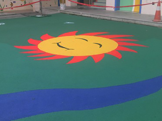 幼兒園塑膠場地膠面的實鋪厚度,從膠面底至表面層膠粒的中心,一般按兩方面控制,首先通過立模進行預檢,對基層局部高出的地方進行修砍或錘擊夯低,如高出不多,修整時采用刮尺上加卡具,離模刮漿,來保證鋪裝厚度。